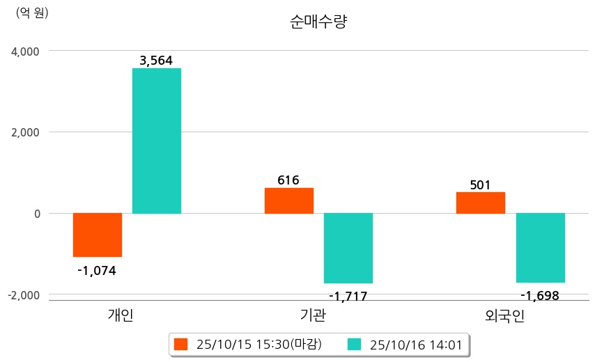 투자자별 동향을 살펴보면 기관은 1,717억 원 순매도했으며, 외국인은 1,698억 원 순매도했다. 개인은 3,564억 원 순매수했다.