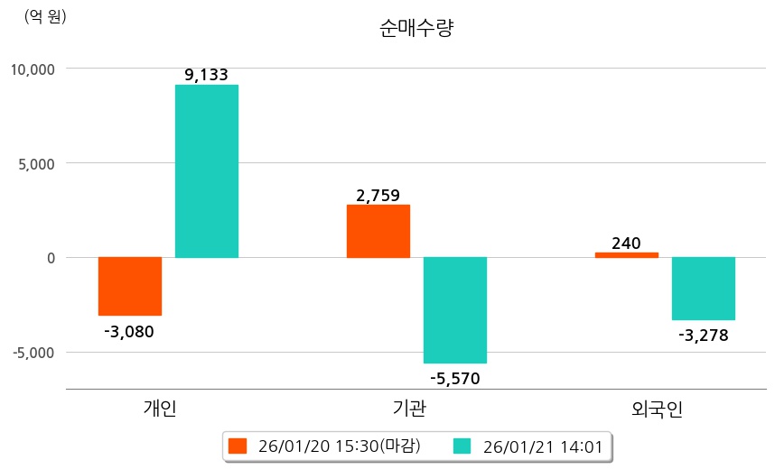 투자자별 동향을 살펴보면 기관은 5,570억 원 순매도했으며, 외국인은 3,278억 원 순매도했다. 개인은 9,133억 원 순매수했다.