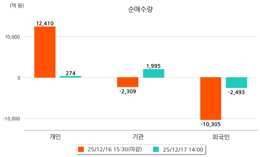 투자자별 동향을 살펴보면 기관은 1,995억 원 순매수했으며, 외국인은 2,493억 원 순매도했다. 개인은 274억 원 순매수했다.