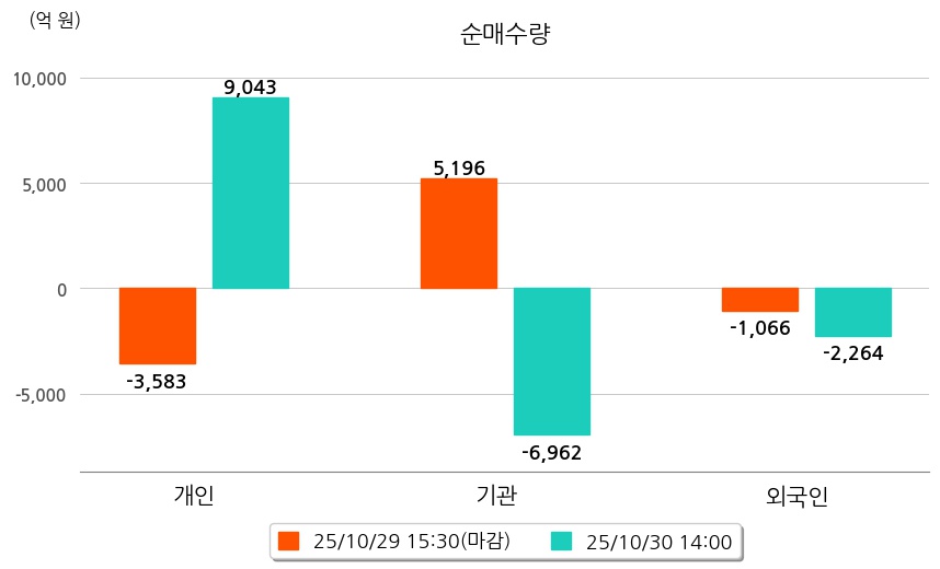 투자자별 동향을 살펴보면 기관은 6,962억 원 순매도했으며, 외국인은 2,264억 원 순매도했다. 개인은 9,043억 원 순매수했다.