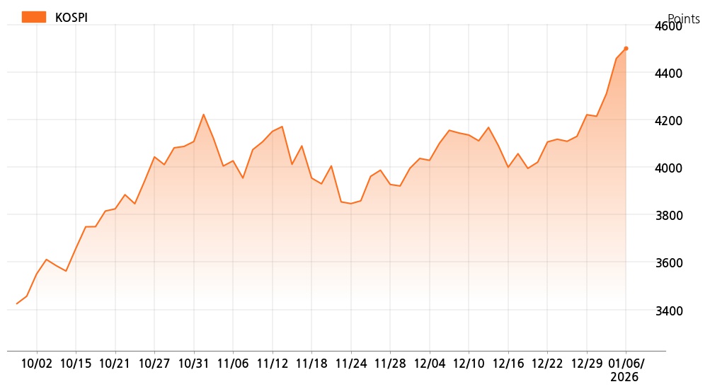 6일 오후 2시 코스피(4,501.22p, 43.70p, +0.98%)는 개인 매수가 늘면서 상승세를 보이고 있다.