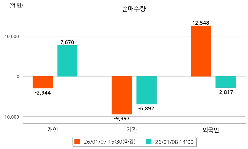 투자자별 동향을 살펴보면 기관은 6,892억 원 순매도했으며, 외국인은 2,817억 원 순매도했다. 개인은 7,670억 원 순매수했다.