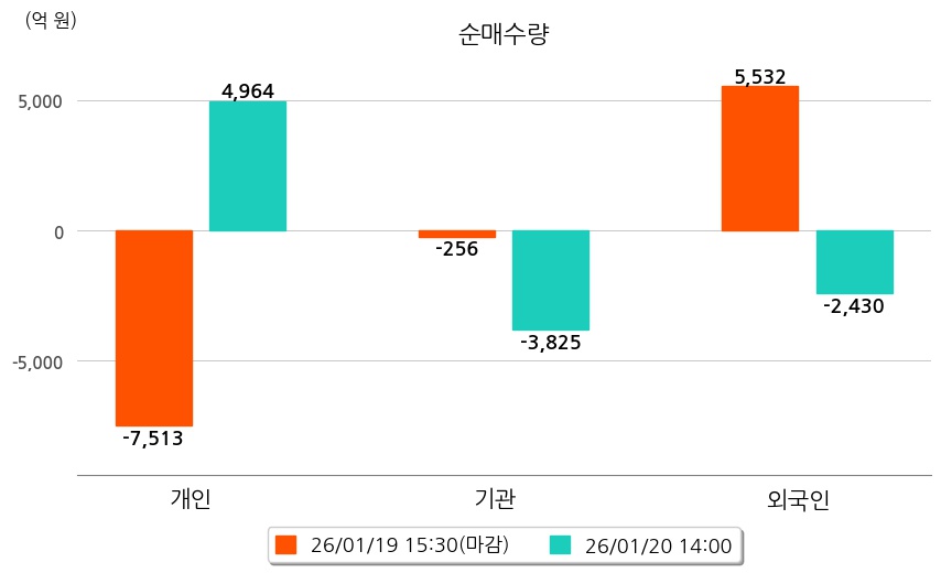 투자자별 동향을 살펴보면 기관은 3,825억 원 순매도했으며, 외국인은 2,430억 원 순매도했다. 개인은 4,964억 원 순매수했다.