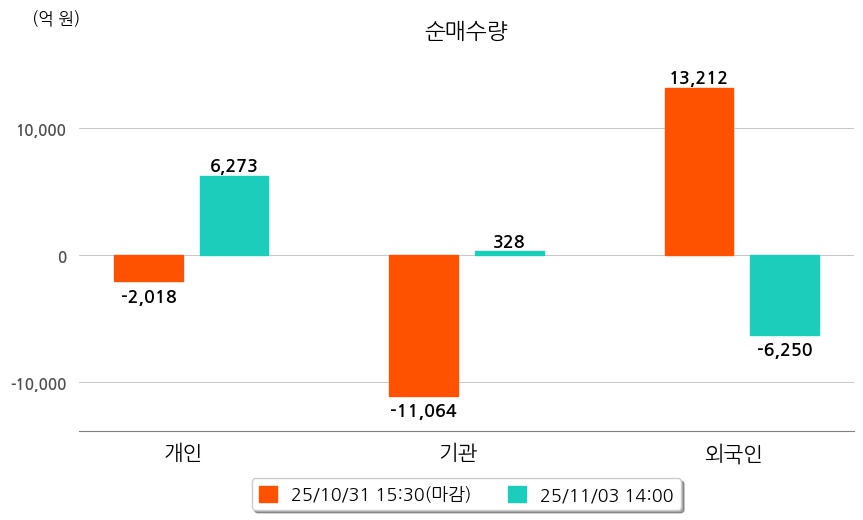 투자자별 동향을 살펴보면 기관은 328억 원 순매수했으며, 외국인은 6,250억 원 순매도했다. 개인은 6,273억 원 순매수했다.