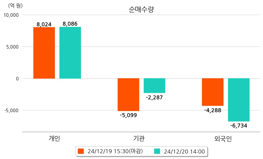 투자자별 동향을 살펴보면 기관은 2,287억 원 순매도했으며, 외국인은 6,734억 원 순매도했다. 개인은 8,086억 원 순매수했다.