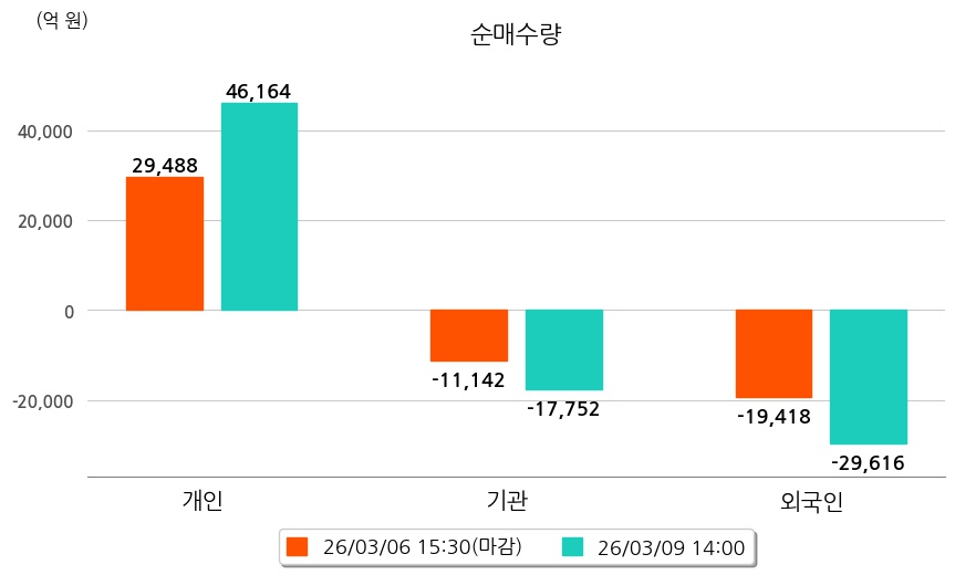투자자별 동향을 살펴보면 기관은 17,752억 원 순매도했으며, 외국인은 29,616억 원 순매도했다. 개인은 46,164억 원 순매수했다.