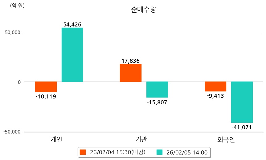 투자자별 동향을 살펴보면 기관은 15,807억 원 순매도했으며, 외국인은 41,071억 원 순매도했다. 개인은 54,426억 원 순매수했다.