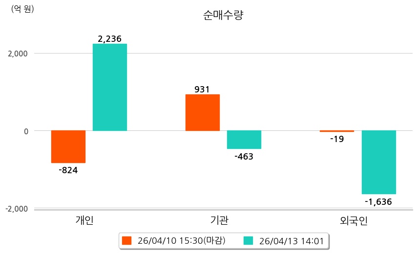 투자자별 동향을 살펴보면 기관은 463억 원 순매도했으며, 외국인은 1,636억 원 순매도했다. 개인은 2,236억 원 순매수했다.