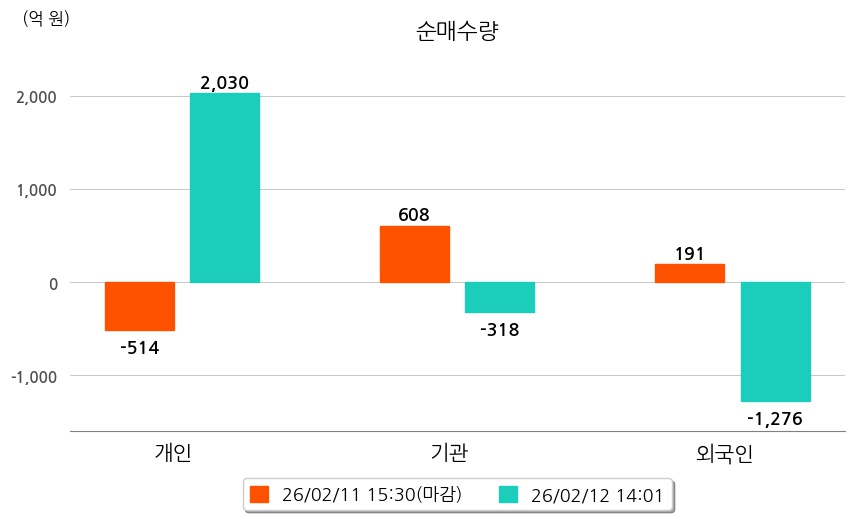 투자자별 동향을 살펴보면 기관은 318억 원 순매도했으며, 외국인은 1,276억 원 순매도했다. 개인은 2,030억 원 순매수했다.
