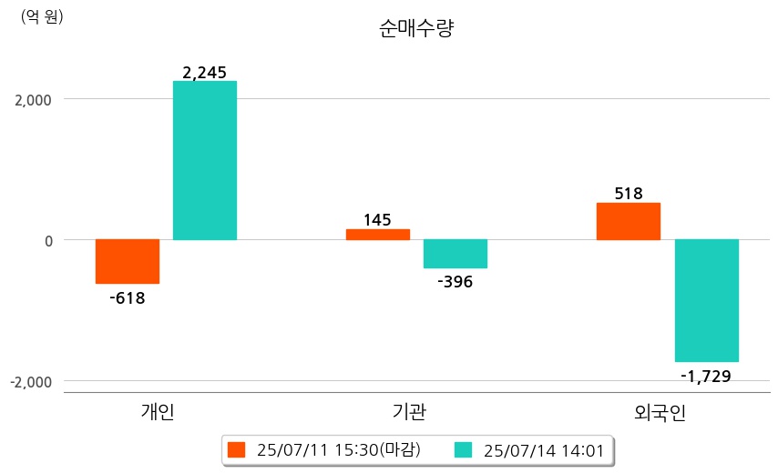 투자자별 동향을 살펴보면 기관은 396억 원 순매도했으며, 외국인은 1,729억 원 순매도했다. 개인은 2,245억 원 순매수했다.