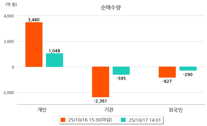 투자자별 동향을 살펴보면 기관은 595억 원 순매도했으며, 외국인은 290억 원 순매도했다. 개인은 1,048억 원 순매수했다.