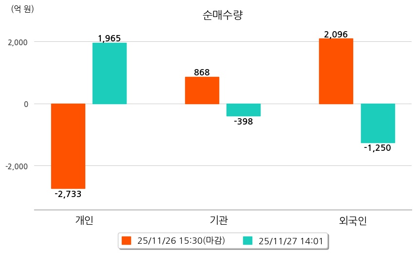 투자자별 동향을 살펴보면 기관은 398억 원 순매도했으며, 외국인은 1,250억 원 순매도했다. 개인은 1,965억 원 순매수했다.
