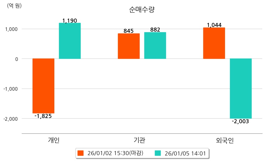 투자자별 동향을 살펴보면 기관은 882억 원 순매수했으며, 외국인은 2,003억 원 순매도했다. 개인은 1,190억 원 순매수했다.