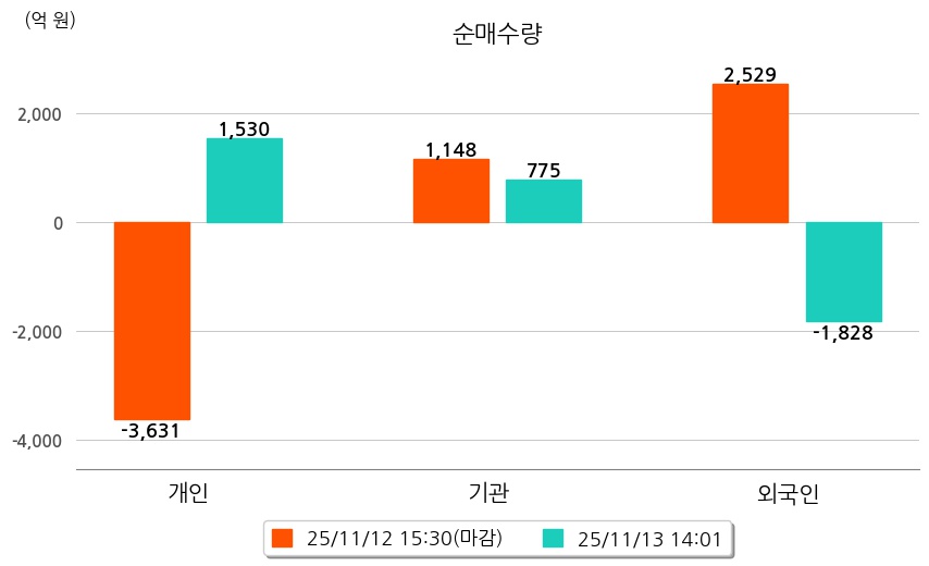투자자별 동향을 살펴보면 기관은 775억 원 순매수했으며, 외국인은 1,828억 원 순매도했다. 개인은 1,530억 원 순매수했다.