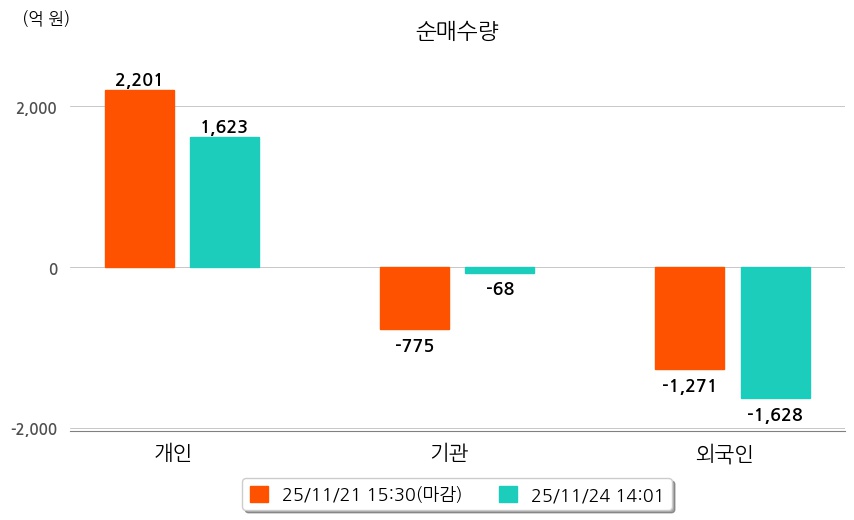 투자자별 동향을 살펴보면 기관은 68억 원 순매도했으며, 외국인은 1,628억 원 순매도했다. 개인은 1,623억 원 순매수했다.