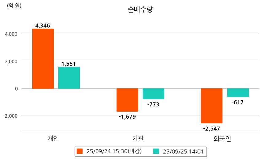투자자별 동향을 살펴보면 기관은 773억 원 순매도했으며, 외국인은 617억 원 순매도했다. 개인은 1,551억 원 순매수했다.