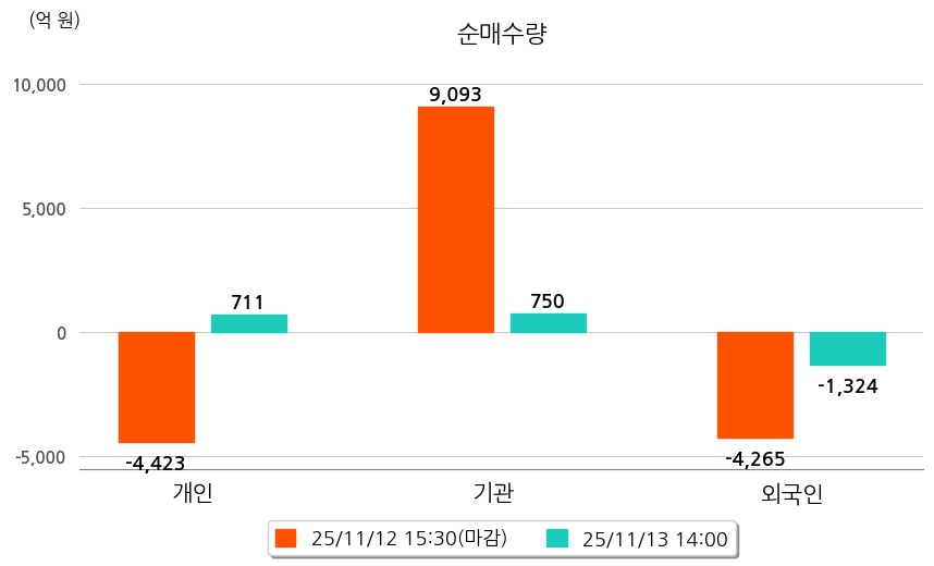투자자별 동향을 살펴보면 기관은 750억 원 순매수했으며, 외국인은 1,324억 원 순매도했다. 개인은 711억 원 순매수했다.