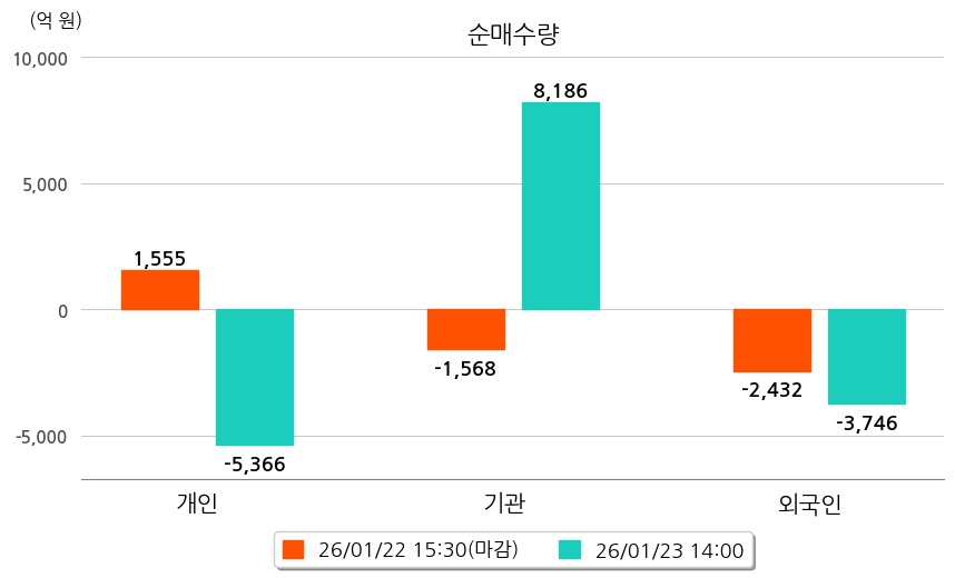 투자자별 동향을 살펴보면 기관은 8,186억 원 순매수했으며, 외국인은 3,746억 원 순매도했다. 개인은 5,366억 원 순매도했다.