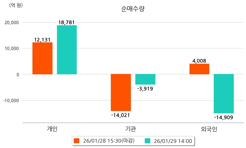 투자자별 동향을 살펴보면 기관은 3,919억 원 순매도했으며, 외국인은 14,909억 원 순매도했다. 개인은 18,781억 원 순매수했다.