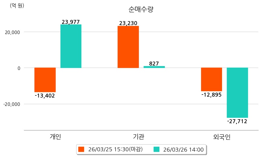 투자자별 동향을 살펴보면 기관은 827억 원 순매수했으며, 외국인은 27,712억 원 순매도했다. 개인은 23,977억 원 순매수했다.