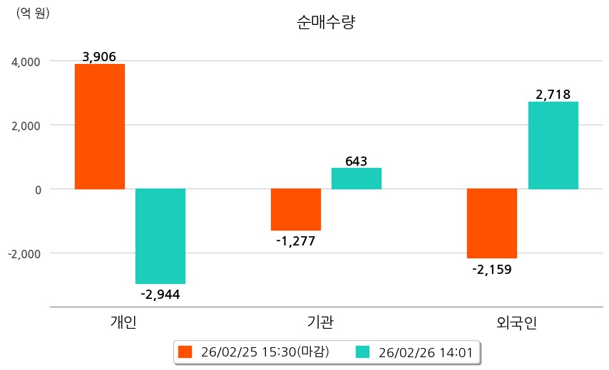 투자자별 동향을 살펴보면 기관은 643억 원 순매수했으며, 외국인은 2,718억 원 순매수했다. 개인은 2,944억 원 순매도했다.