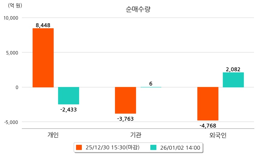 투자자별 동향을 살펴보면 기관은 6억 원 순매수했으며, 외국인은 2,082억 원 순매수했다. 개인은 2,433억 원 순매도했다.