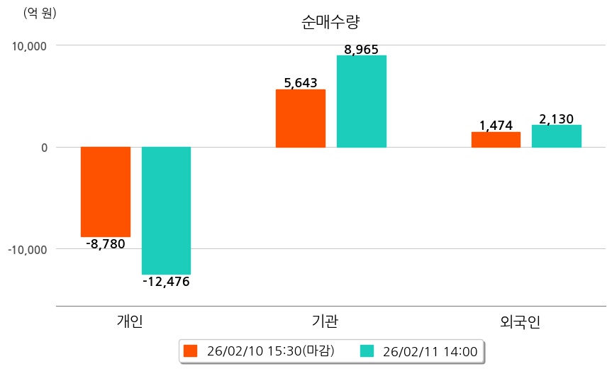 투자자별 동향을 살펴보면 기관은 8,965억 원 순매수했으며, 외국인은 2,130억 원 순매수했다. 개인은 12,476억 원 순매도했다.