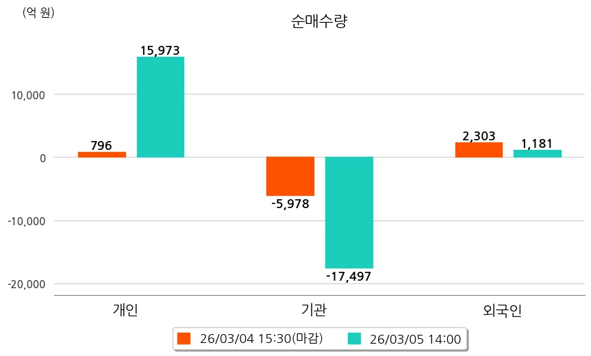 투자자별 동향을 살펴보면 기관은 17,497억 원 순매도했으며, 외국인은 1,181억 원 순매수했다. 개인은 15,973억 원 순매수했다.