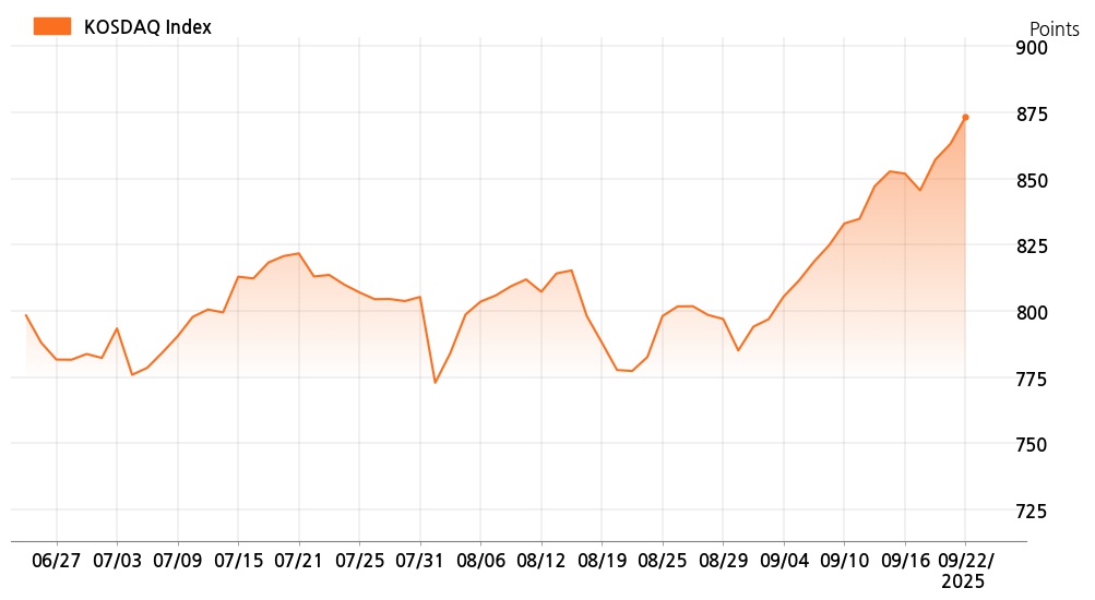 22일 오후 2시 코스닥(873.30p, 10.19p, +1.18%)는 개인 매수가 늘면서 상승세를 보이고 있다.
