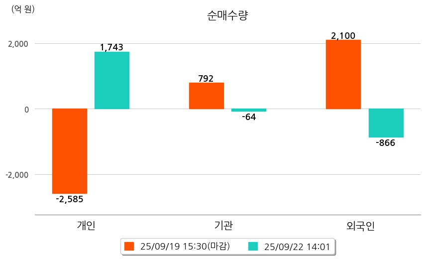 투자자별 동향을 살펴보면 기관은 64억 원 순매도했으며, 외국인은 866억 원 순매도했다. 개인은 1,743억 원 순매수했다.