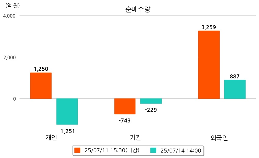 투자자별 동향을 살펴보면 기관은 229억 원 순매도했으며, 외국인은 887억 원 순매수했다. 개인은 1,251억 원 순매도했다.