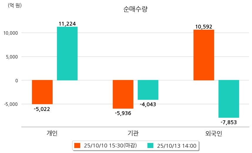 투자자별 동향을 살펴보면 기관은 4,043억 원 순매도했으며, 외국인은 7,853억 원 순매도했다. 개인은 11,224억 원 순매수했다.