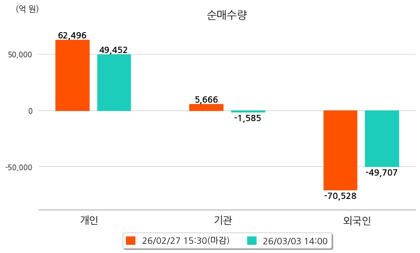 투자자별 동향을 살펴보면 기관은 1,585억 원 순매도했으며, 외국인은 49,707억 원 순매도했다. 개인은 49,452억 원 순매수했다.
