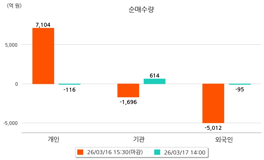 투자자별 동향을 살펴보면 기관은 614억 원 순매수했으며, 외국인은 95억 원 순매도했다. 개인은 116억 원 순매도했다.