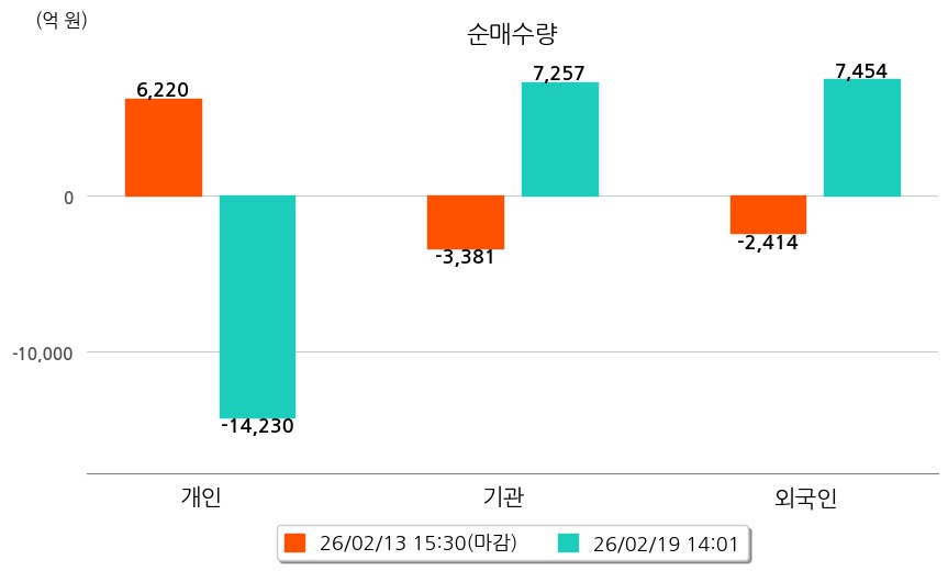 투자자별 동향을 살펴보면 기관은 7,257억 원 순매수했으며, 외국인은 7,454억 원 순매수했다. 개인은 14,230억 원 순매도했다.