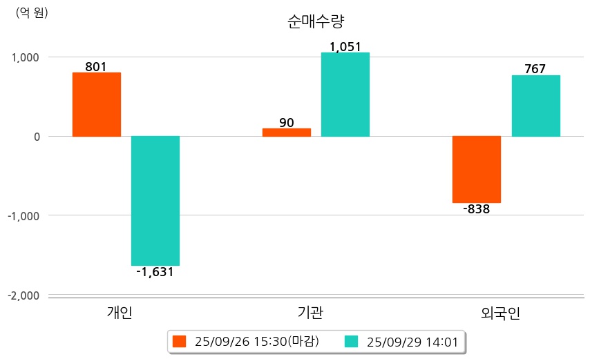 투자자별 동향을 살펴보면 기관은 1,051억 원 순매수했으며, 외국인은 767억 원 순매수했다. 개인은 1,631억 원 순매도했다.
