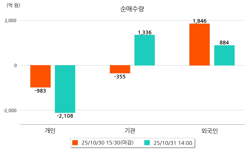 투자자별 동향을 살펴보면 기관은 1,336억 원 순매수했으며, 외국인은 884억 원 순매수했다. 개인은 2,108억 원 순매도했다.