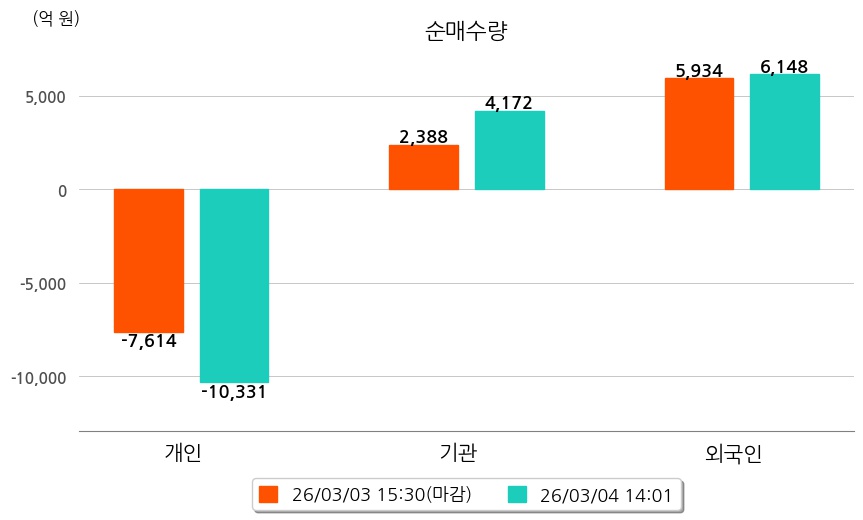 투자자별 동향을 살펴보면 기관은 4,172억 원 순매수했으며, 외국인은 6,148억 원 순매수했다. 개인은 10,331억 원 순매도했다.