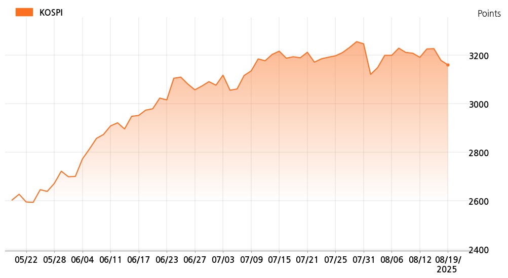 19일 오후 2시 코스피(3,158.60p, 18.68p, -0.59%)는 외국인 매도가 늘면서 하락세를 보이고 있다.