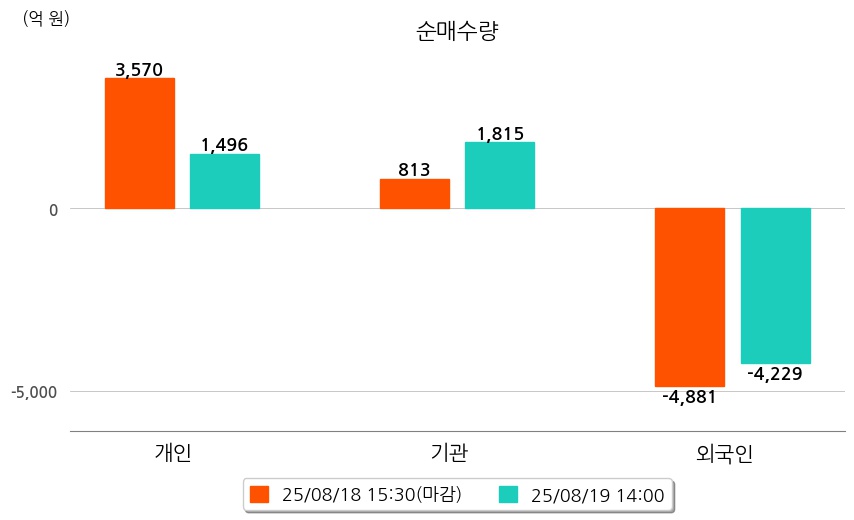 투자자별 동향을 살펴보면 기관은 1,815억 원 순매수했으며, 외국인은 4,229억 원 순매도했다. 개인은 1,496억 원 순매수했다.