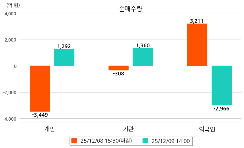 투자자별 동향을 살펴보면 기관은 1,360억 원 순매수했으며, 외국인은 2,966억 원 순매도했다. 개인은 1,292억 원 순매수했다.