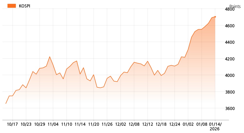 14일 오후 2시 코스피(4,705.33p, 12.69p, +0.27%)는 기관 매수가 늘면서 상승세를 보이고 있다.
