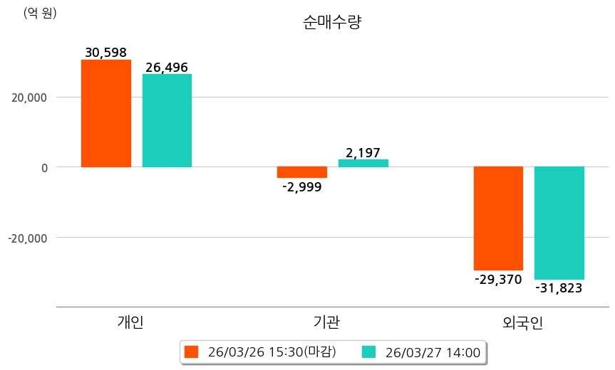 투자자별 동향을 살펴보면 기관은 2,197억 원 순매수했으며, 외국인은 31,823억 원 순매도했다. 개인은 26,496억 원 순매수했다.