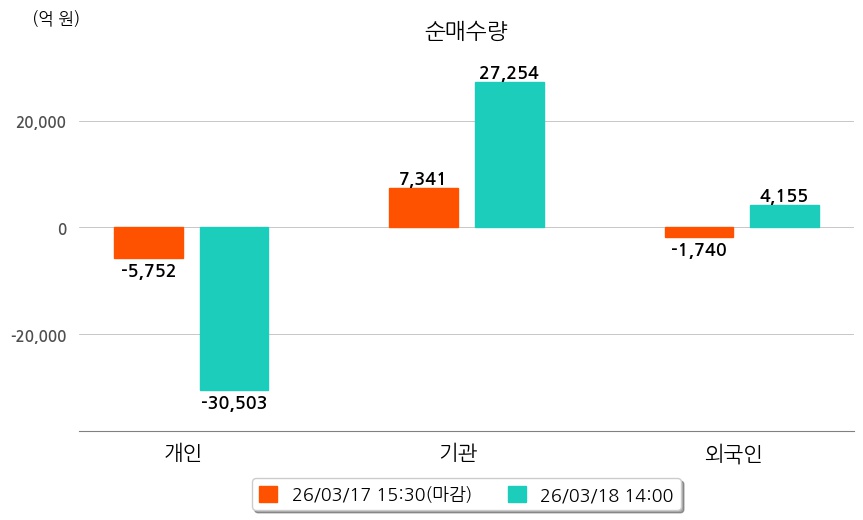 투자자별 동향을 살펴보면 기관은 27,254억 원 순매수했으며, 외국인은 4,155억 원 순매수했다. 개인은 30,503억 원 순매도했다.