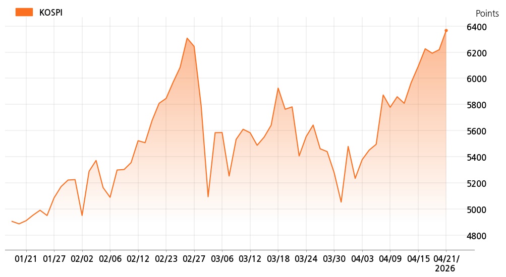 21일 오후 2시 코스피(6,366.75p, 147.66p, +2.37%)는 외국인 매수가 늘면서 상승세를 보이고 있다.