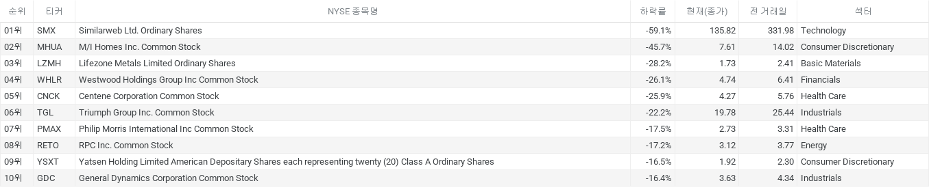 NYSE(뉴욕증권거래소) 하락률 Top10 종목