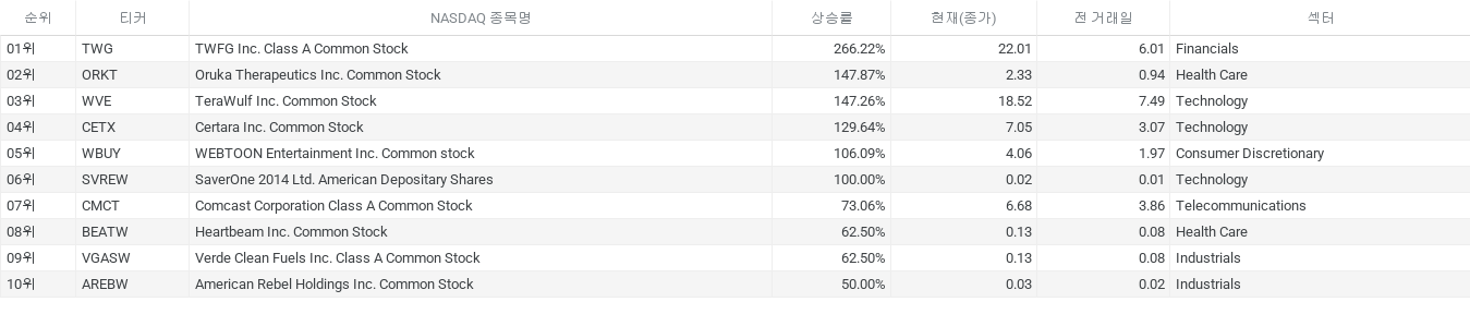 – NASDAQ 상승률 Top 종목 : TWFG Inc. Class A Common Stock (TWG) : 266.2%