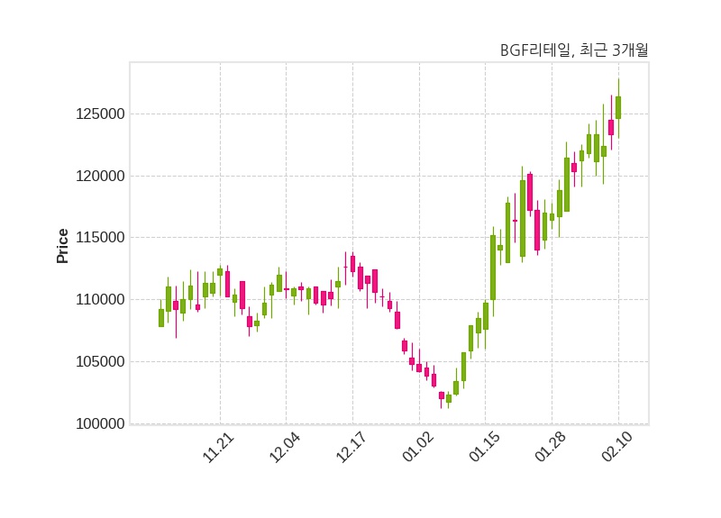 한편, BGF리테일의 15시 03분 현재주가는 126,400원으로 직전 거래일 대비 3,100원(+2.51%) 상승이며, 거래량은 66,788주이다.