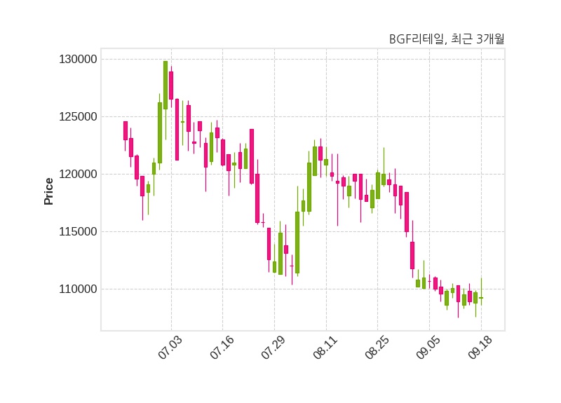 한편, BGF리테일은 장 마감 이후 해당 기업공시를 발표했으며 오늘 종가가 109,300원, 거래량은 43,293주로, 직전 거래일 대비 400원(-0.36%) 하락했다.