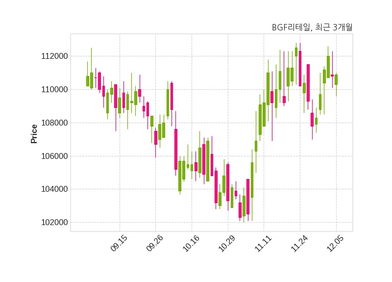 한편, BGF리테일은 장 마감 이후 해당 기업공시를 발표했으며 오늘 종가가 110,900원, 거래량은 16,601주로, 직전 거래일 대비 100원(+0.09%) 상승했다.